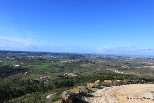 Deixámos as ruas asfaltadas e entrámos nos trilhos ainda com algum orvalho para testar o GORE-TEX. Funciona, os pés estiveram sempre quentes e secos. Ainda não tínhamos aquecido e já víamos pela frente a valente subida até ao topo da serra do Socorro. E é só isto que há a dizer da subida, valente subida. Fotos, há poucas, só quando atingimos uma cota que nos permitia avistar o Oceano Atlântico. O céu tinha algumas nuvens mas mesmo assim as fotos ficaram boas, dá para perceber o que subimos.