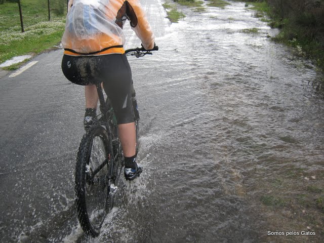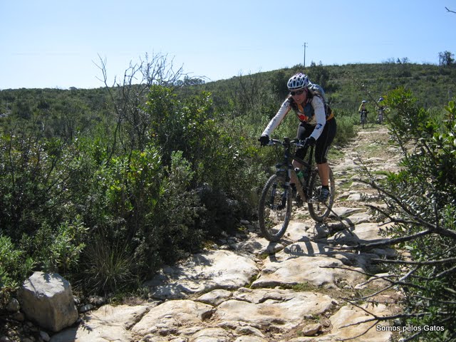 A seguir vieram uma sucessão de single-tracks com pedras escorregadias (as tais roliças) e começámos a ver a coisa complicada. Os pneus tinham ar a mais, mas não era por isso. Quando as pedras estão molhadas torna-se difícil. Pedalámos, desmontámos, andámos, pedalámos, desmontámos à pressa, voltámos a pedalar... Foi assim durante uns quilómetros.